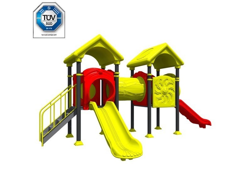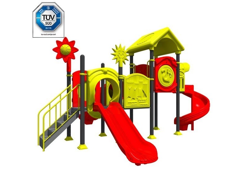 1. Outdoor playground consisting of a mix of attractions that ensure ample playability and fun. Made of aluminum and polyethylene, it guarantees the safety of all its guests and offers the possibility to choose between different game components. Product compliant with EN 1176 Standards.
