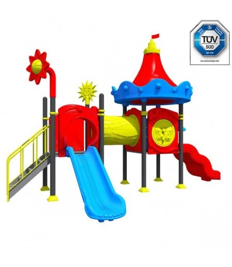 Teren de joacă în aer liber format dintr-un amestec de atracții care asigură o joacă și distracție ample. Fabricat din aluminiu și polietilenă, garantează siguranța tuturor oaspeților săi și oferă posibilitatea de a alege între diferite componente de joc. Produs conform cu standardele EN 1176.